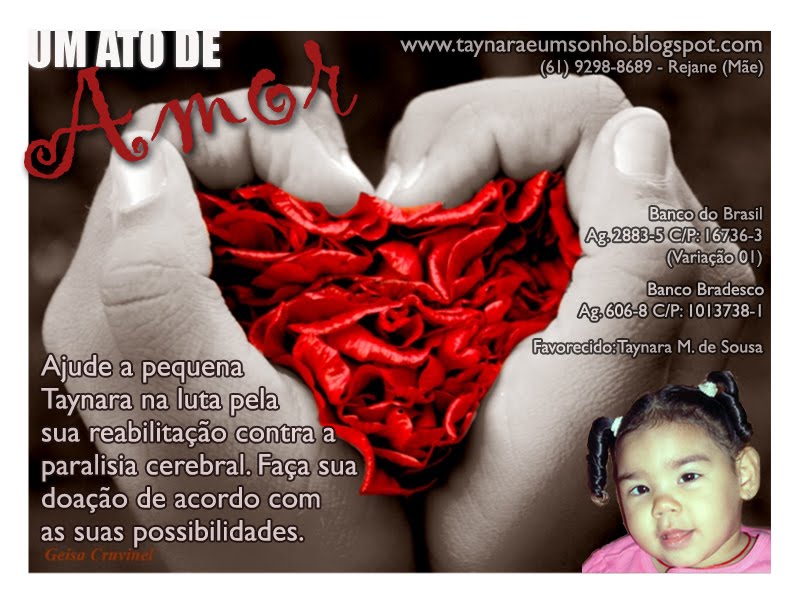 Ser mãe é uma dávida de DEUS e por ser mãe desta criança muito bonita é que busco forças para poder realizar este sonho de fazer este tratamento com TAYNARA e para que um dia ela tenha que chegar perto do normal já que qualquer que seja comprometimento no cérebro se torna difícil para o ser humano, mais como hoje a medicina e DEUS está acima de tudo porque não tentar fazer este tratamento pois assim no futuro eu como mãe não posso dizer que fracassei em sua reabilitação, porque até hoje eu não esqueço das palavras da chefe de seção da UTI neonatal ela falou assim “Apartir de hoje a sua vida mudou pra melhor e Taynara vai te trazer muitas felicidades” e digo pra toda mãe de criança especial “Deus nos deu estas crianças não pela dor e sim pelo amor que temos” por que a cada dia apreendemos muito com elas e minha filha é uma dávida dado por DEUS.